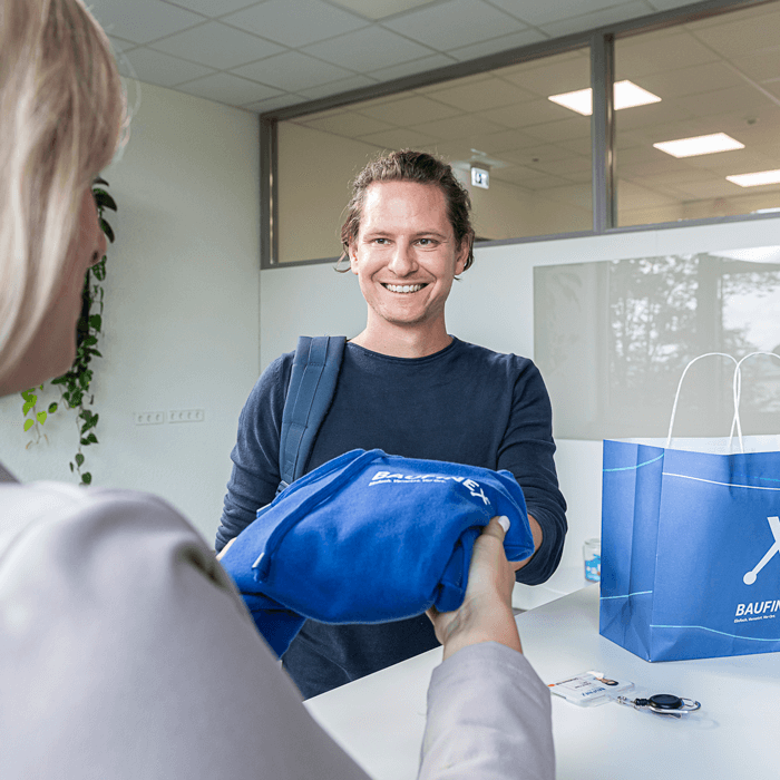 Wir lieben und leben die Diversity unserer Mitarbeiter:innen. An deinem ersten Tag bei uns wirst du zwar mit deinem BAUFINEX Hoodie und Shirt ausgestattet – doch keine Angst, das ist kein Dresscode. Eigentlich wollen wir dir damit nur sagen: Willkommen in unserem Team, wir sind gespannt darauf, dich kennenzulernen und freuen uns riesig auf die gemeinsame Zeit.